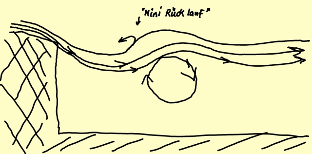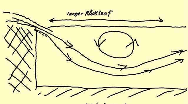 Warum sind ganz harmlos aussehende Walzen an Wehren und Sohl-/Pegelschwellen (Beispiel aus dem Wanderbereich Tosbecken beim Wehr am Kocher bei Abtsgemünd) so lebensgefährlich, wohingegen mit lautem Getöse donnernde Wehrüberläufe oft gar nicht so schlimm sind ? Das hängt mit dem Rücklauf in der oberen Walze zusammen, denn die Länge und 'Wucht' des Rücklaufs entscheidet darüber, ob sich der Kanufahrer, wenn er im Walzenverschnitt hängen geblieben ist, wieder 'freistrampeln' kann. In der Zeitschrift Kanusport 2006, Heft 3 (März), S. 30-31 wurde ein kurzer Artikel mit Bildern veröffentlicht, der Ergebnisse einer Diplomarbeit (Autor:Andreas Haas) wiedergibt . Es ist sehr empfehlenswert, sich dies anzuschauen. Da ich aus urheberrechtlichen Gründen das Ganze nicht einfach abkupfern darf, möchte ich 2 selbstgezeichnete Skizzen zeigen und kurz in meinen Worten (also eine Art 'abstract') wiedergeben, was der Autor veröffentlicht hat und möchte nochmals darauf hinweisen, daß es sich rentiert, den Artikel zu lesen.