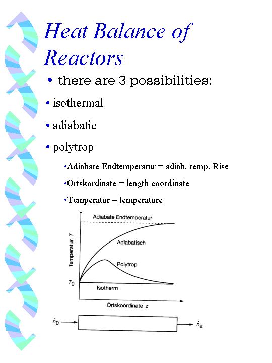 | adiabatic | no heat exchange with the surrounding, heat can only be 'removed' by convective flow in continuous reactors | too high heat production a bit more difficult reactor design |