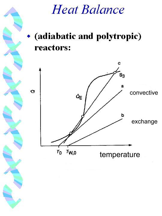 As this heat has to 'go somewhere' - and in a stable operation mode exactly in a way that the produced and removed heat are equal - you have to search where you can find 'stable' points of intersection of the S-shaped heat production curve and the 'curve' for the 'removing process', - take curve 'c' as an example, without knowing what it represents. These processes might be: the convective flow for an adiabatic CSTR and the convective flow and the heat exchange process for a polytropic CSTR. Both processes exhibit linear functions of dQ/dt versus Temperature (see general heat balance). Therefore curve 'a' could be the heat-removing-curve for some special convective flow. As you realize, 'a' has no intersection with the heat production curve: this convective flow can not 'stabilize' the reactor thermally. Let us take curve 'c' now as a special convective flow. Here we have 3 intersections. The point in the middle of the S has a special feature: when you leave the intersection point in an incremental manner, you will 'rush' either upward on the route of the heat production curve or downward 'along' the 'heat removing curve', - and in both cases 'so long' till you have reached one of the two other intersection points. We call this an 'instable status' of the heat balance or instable operation mode, whereas the other two values are 'stable'. Now a last 'contemplation': let us suppose that the convective flow represented by curve 'a' can not stabilize our adiabatic reactor, as already realized, - what to do then? When the convective flow should not be changed, you could only change its 'input temperature' or you give up the adiabatic operation mode and add a heat exchange equipment. In this polytropic operation mode 'c' as sum of 'a' and 'b' (heat exchange term!) will work in the right manner.