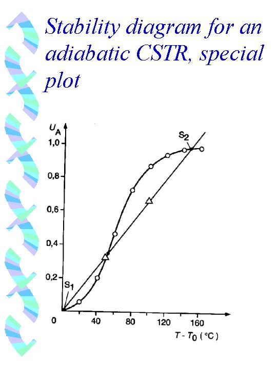 Usually the stability plots of (adiabatic/polytropic) CSTRs show the produced or removed heat(s) versus temperature. But, as already seen for the 1/r(U,T) -plot, it is 'comfortable' to take the conversion as one of the plot-parameters, because this enables a more general presentation (in comparison to e.g. concentration vs T and t.). When we take a plot with the temperature on the x-axis and the conversion on the y-axis, our first advantage is again (as in the 1/r(U,T)-plot) that our function for the heat production by the chemical reaction is a straight line (adiabatic temperature rise! rem: when you take (T-T0) for the temperature, you get a 'normalized' line, running through the origin). On the other side depends the conversion on the temperature as given by the kinetic laws, especially the Arrhenius equation. As we have no 'running' time in a stationary CSTR, - we have only a constant space time (residence time, reaction time), the conversion is a function of the temperature in the vessel. But as already mentioned (and hope in meantime well known) the application of the Arrhenius equation yields a S-shaped curve (for irreversible exothermic reactions, - and some sort of bell-shaped curve for reversible reactions, more ? )). This curve is analogous to the chemical heat production curve in the 'usual' stability diagrams, - but it is not the same!! - we could call it the 'temperature dependent kinetic curve', - whereas the heat production curve is the straight line (adiabatic temp.-rise). If you look at such a plot now, you find again stable and instable operation modes and can discuss the matter in the same manner as 'usual':